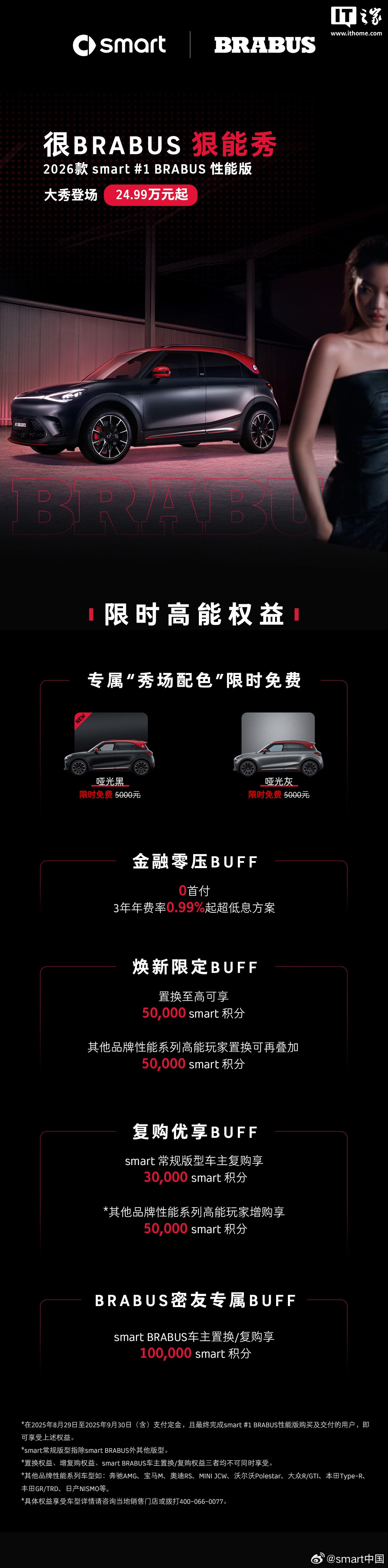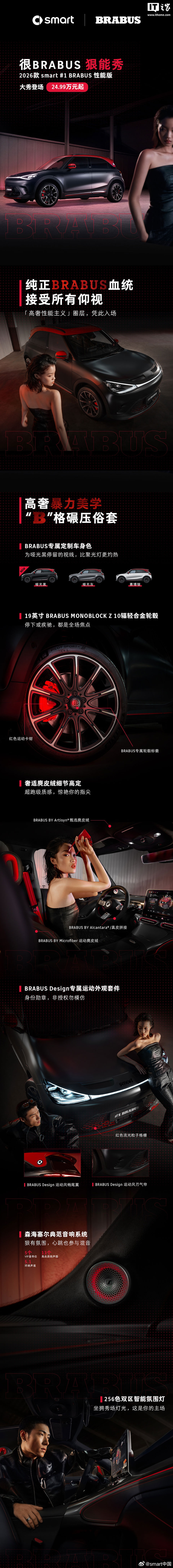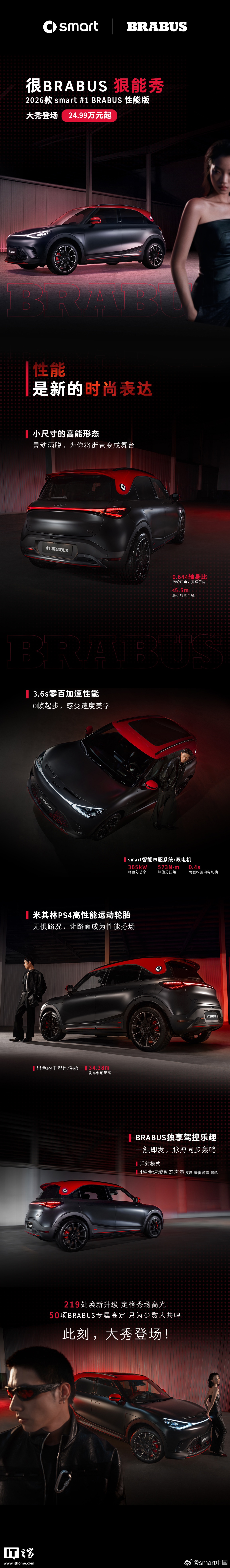 IT之家 8 月 29 日消息,2026 款 smart 精灵#1 BRABUS 性能版已上市,官方指导价为 24.99 万元起,新车在外观、配置和性能方面进行了升级。